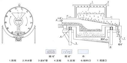 料漿分級篩主要由篩網、提渣板、沖洗水管、收渣斗、進漿排渣管、接礦斗和傳動機構組成。工作時,裝配篩網的圓筒在傳動機構的驅動下旋轉,礦漿從進漿排渣管的左下部給入到篩網的圓周上。細粒礦物和水穿過篩網落入到接礦斗,沿管道自流至下一道工藝。粗粒部分被提渣板提至頂部被沖洗水沖入收渣斗排走。